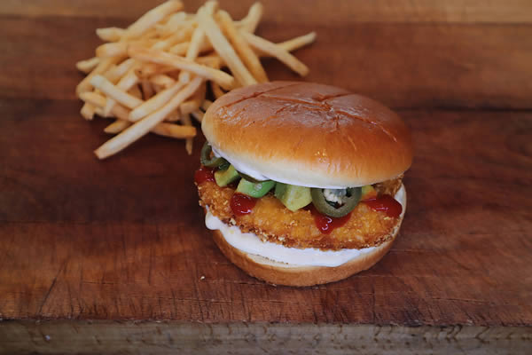 Krispig kycklinghamburgare med avokado. Vitlöksdressing, avokado, sriracha och jalapeños. Serveras med pommes frites.